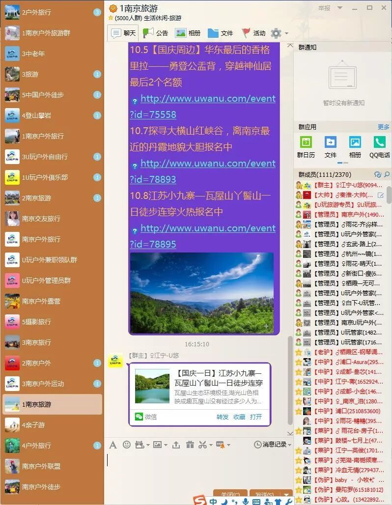 南京U玩户外俱乐部拥有5000人群3个,2000人群8个,1000人群6个,500人群十余个。总群员20000余人,为南京最大的同城户外、旅行类QQ社群。