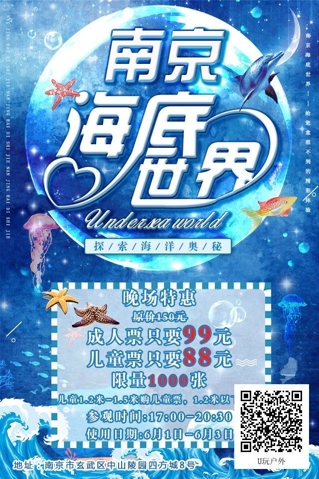 【使用时间】6月1日-6月3日; 【入园时间】17:00-19:30; 【开放时间】17:00-20:30; 【费用包含】南京海底世界晚场成人特惠票1张, 门票包含:水族馆、海底隧道、海豚馆表演、水母馆、极地馆参观及观看表演。另付费项目:购物、用餐、观看3D/5D电影、动物喂食。(仅供参考,具体请以景区为准) 【项目行程】 海豚表演时间:20:00 表演地点:海豚馆; 美人鱼表演时间: 19:00 表演地点:一楼表演区; 泡泡秀表演:18:30 表演地点:四楼泡泡体验馆; 【收费标准】1.2-1.5m请购儿童票; 1.5m以上同成人;
