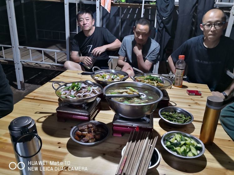 清理之后,准备腐败。怎么还不动手啊,都饿的前胸贴后背了……。等等吧,还有收队没下来呢。领队心疼收队,去接她了,等了好久,终于在黑夜中看到光亮,来了来了……开吃吧。腐败不能没酒啊,在我的建议下,上了两瓶白的荞麦烧,六罐啤酒。吃吧喝吧,大家你来我往,好不热闹。晚上吃鸡,早上成仙。哈哈,多吃点啊,来,吃鸡,蛮好吃的。有人说:鸡臭的!啊!?我都吃了不少了,不早说啊?