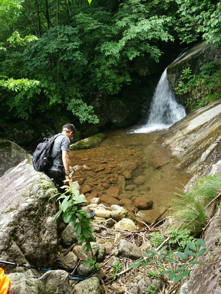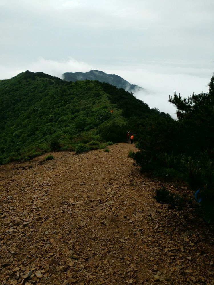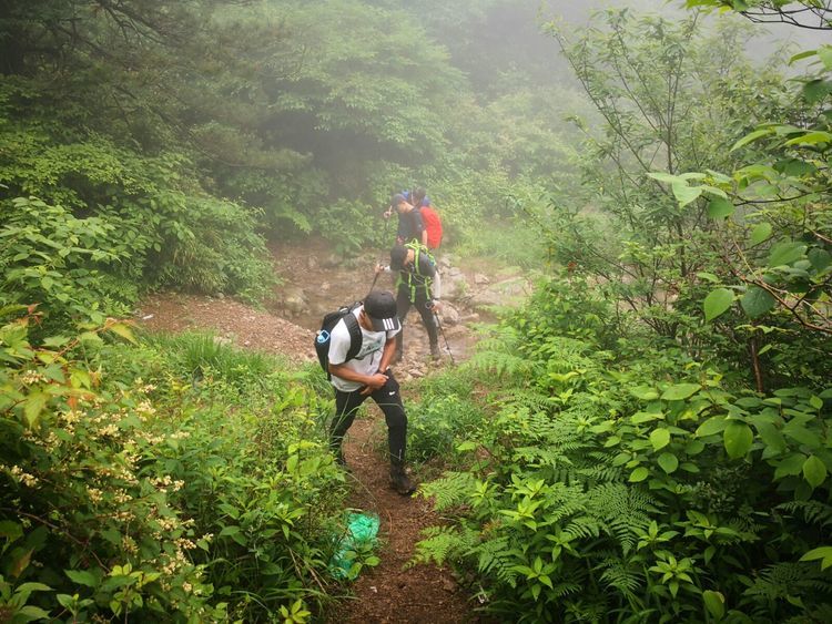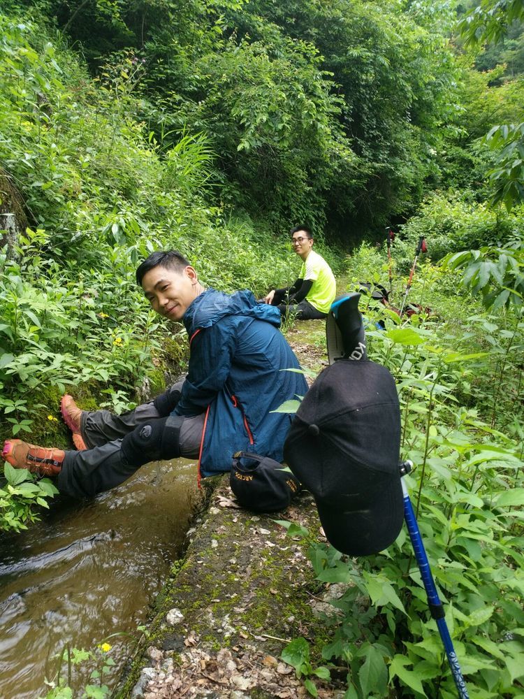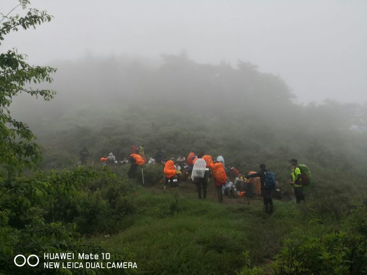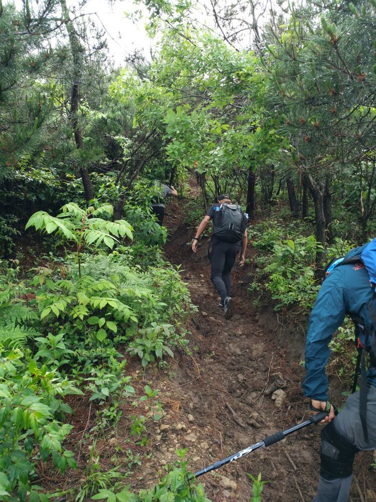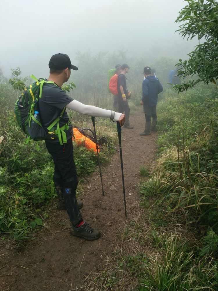 由于前几日三尖一直是雷暴雨,整个山路泥泞不堪。每个人的鞋子早已经湿透。我的衣服也湿透。但全身都冒着热气;尽管登山鞋的齿把滑,但早已被泥巴糊满,走在路上,就像脚底有个香蕉皮,登山杖必不可少!