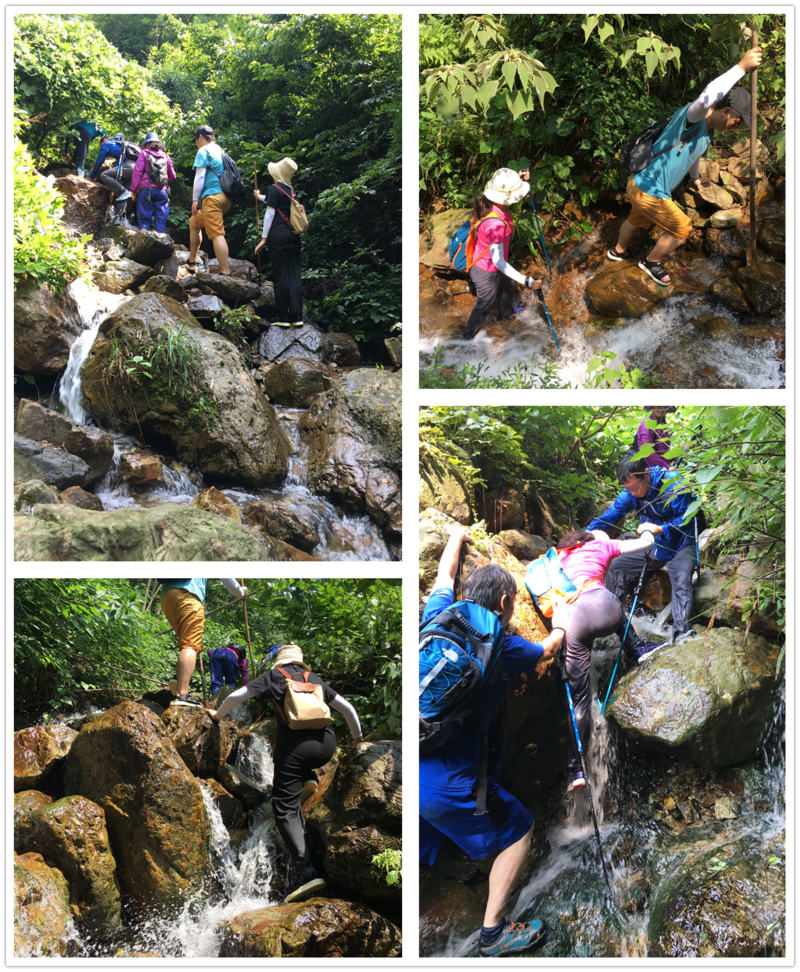 考验来临,河中出现大量落差较大的石壁,只能手脚并用,攀爬上去。清凉的河水激起层层水花,犹如水中攀岩。