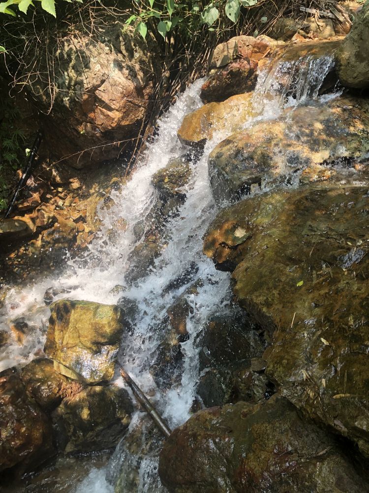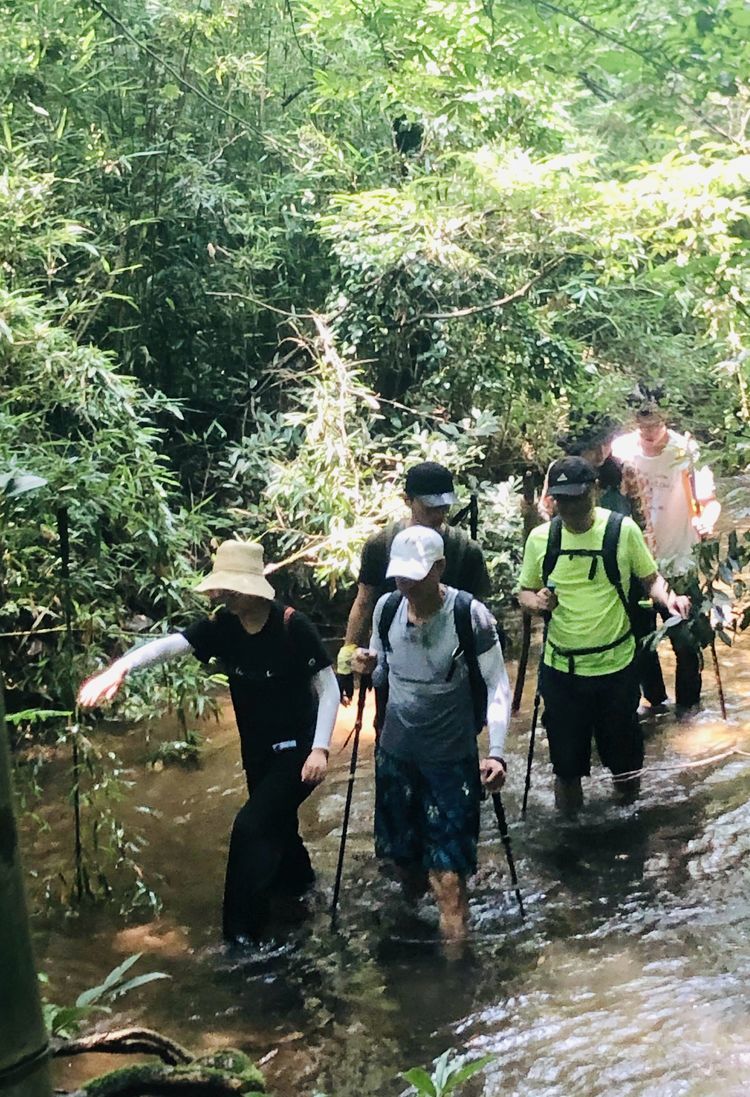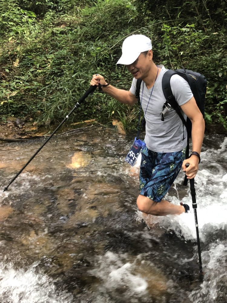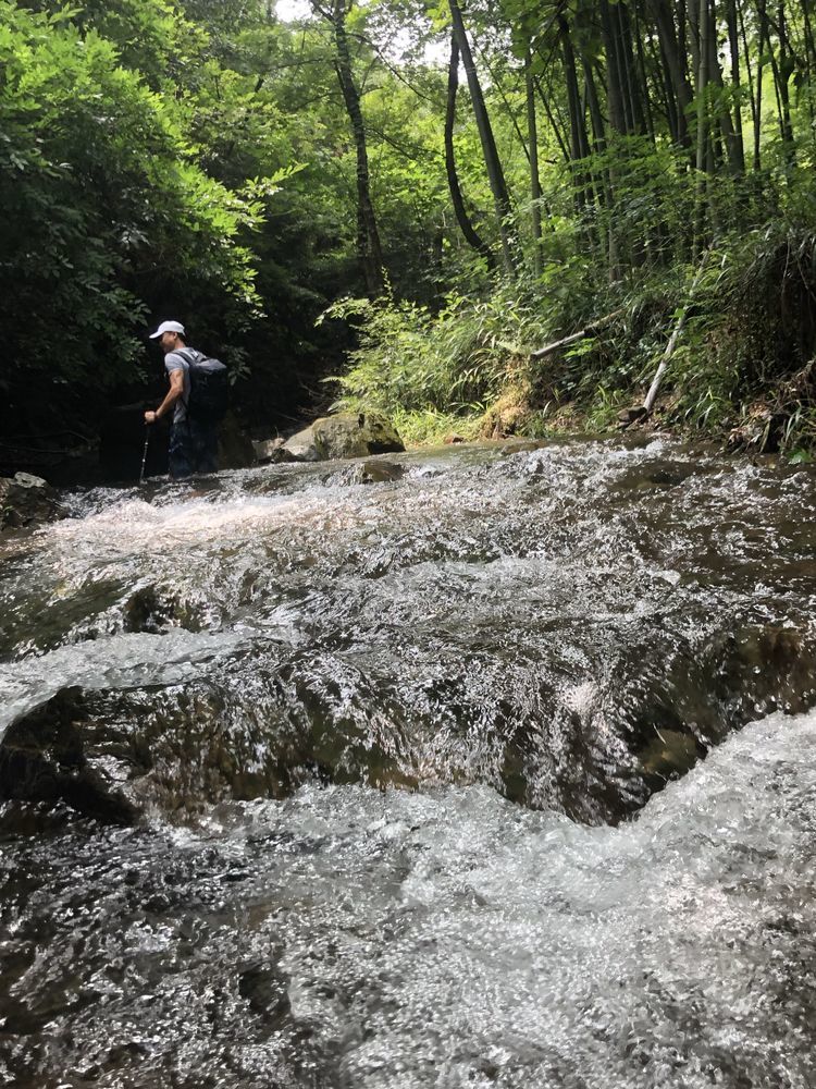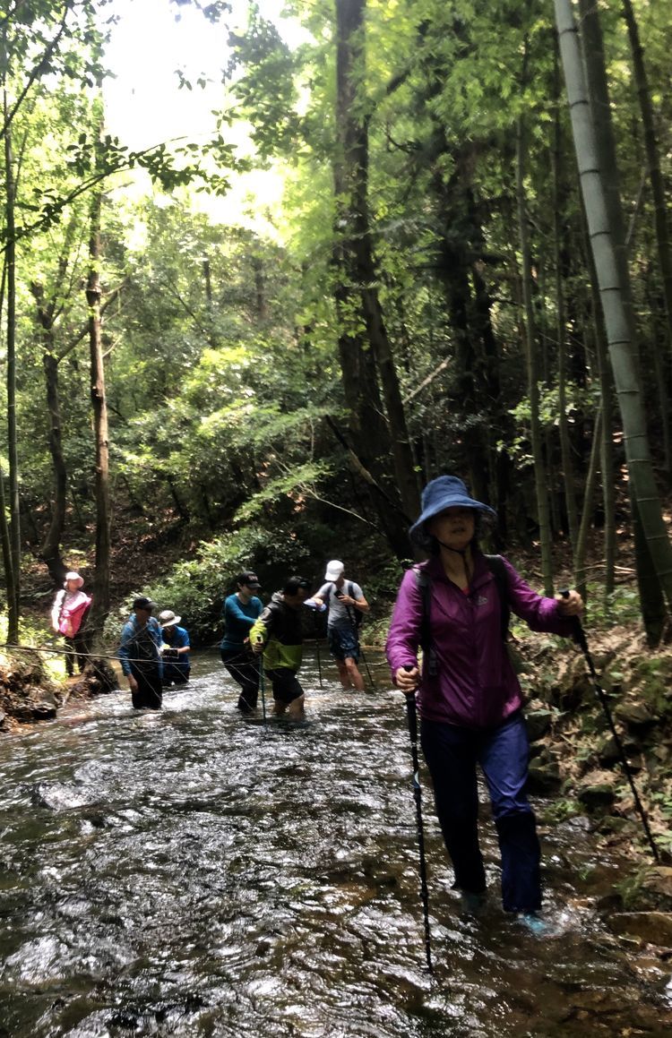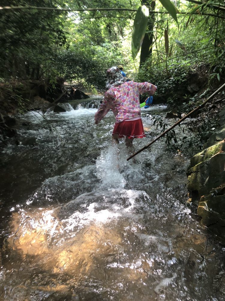 溪边竹林掩映,前日的雨水使溪中的水位有所上升,一般到小腿肚,流水冲刷着细石,发出叮咚之响。人在水中,微凉却不冷,刚刚好。将手机套上防水,走水路溯溪鞋是必备的,否则会麻烦不断。