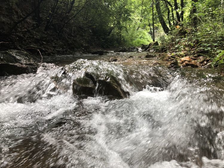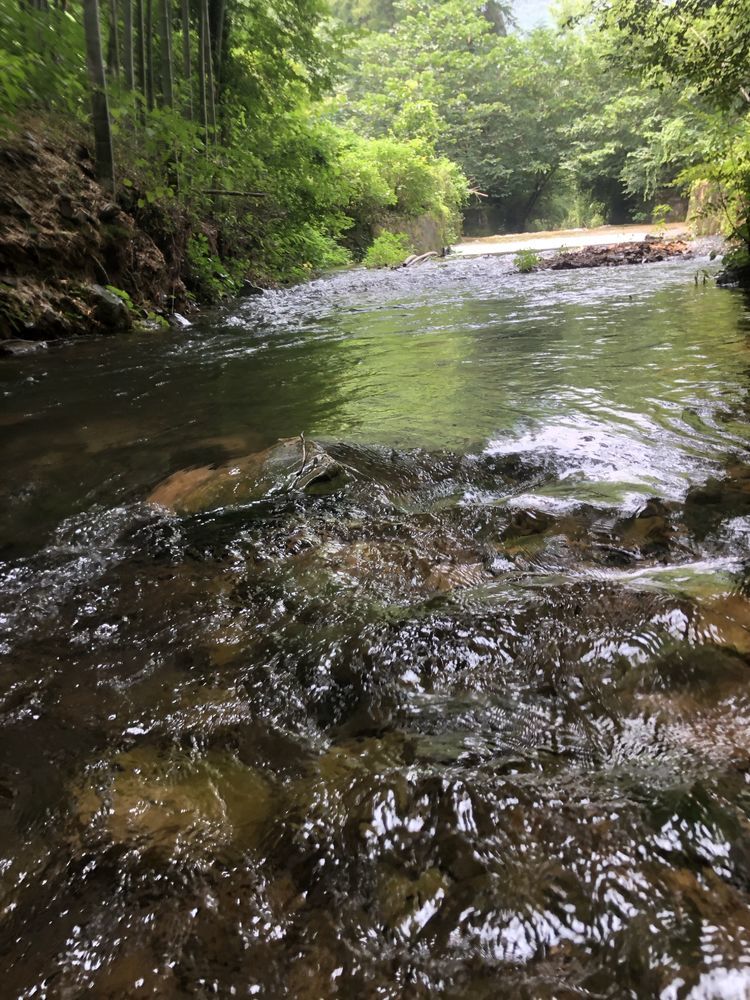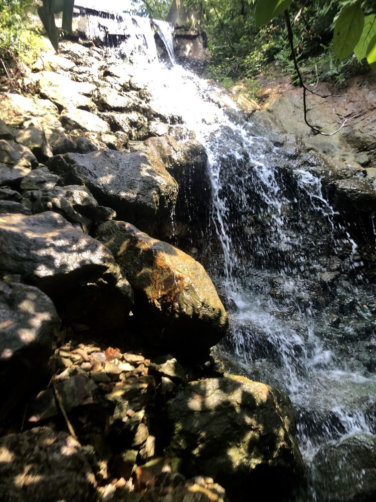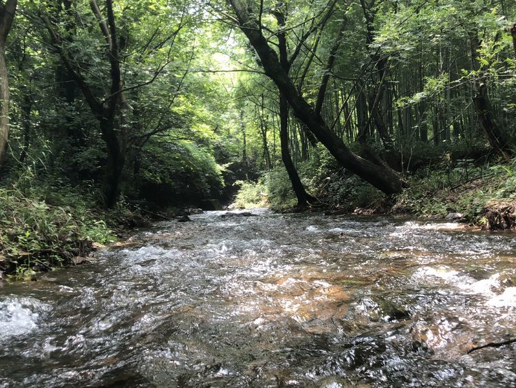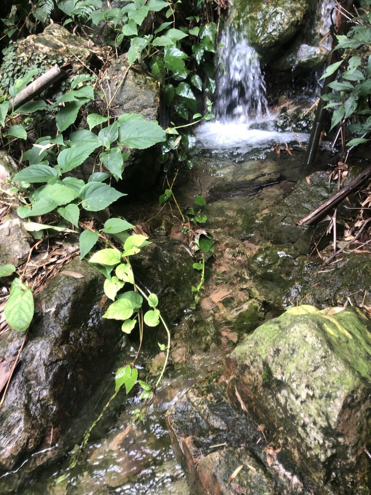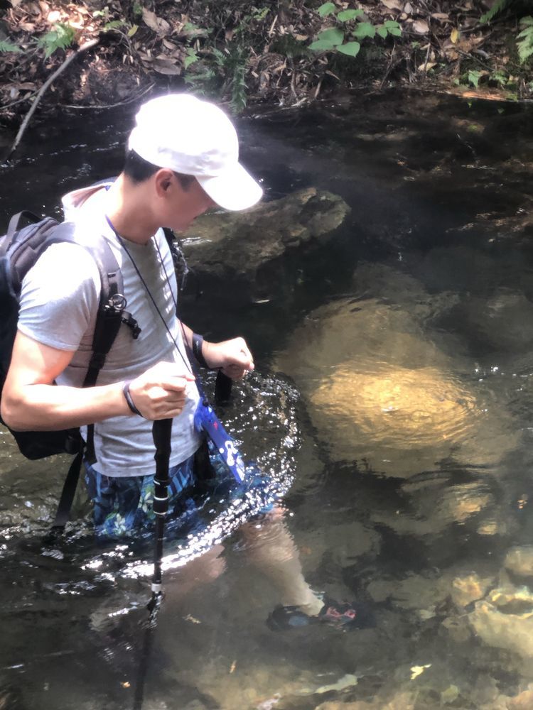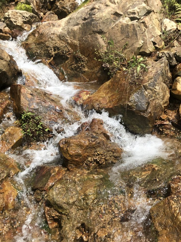 溪边竹林掩映,前日的雨水使溪中的水位有所上升,一般到小腿肚,流水冲刷着细石,发出叮咚之响。人在水中,微凉却不冷,刚刚好。将手机套上防水,走水路溯溪鞋是必备的,否则会麻烦不断。