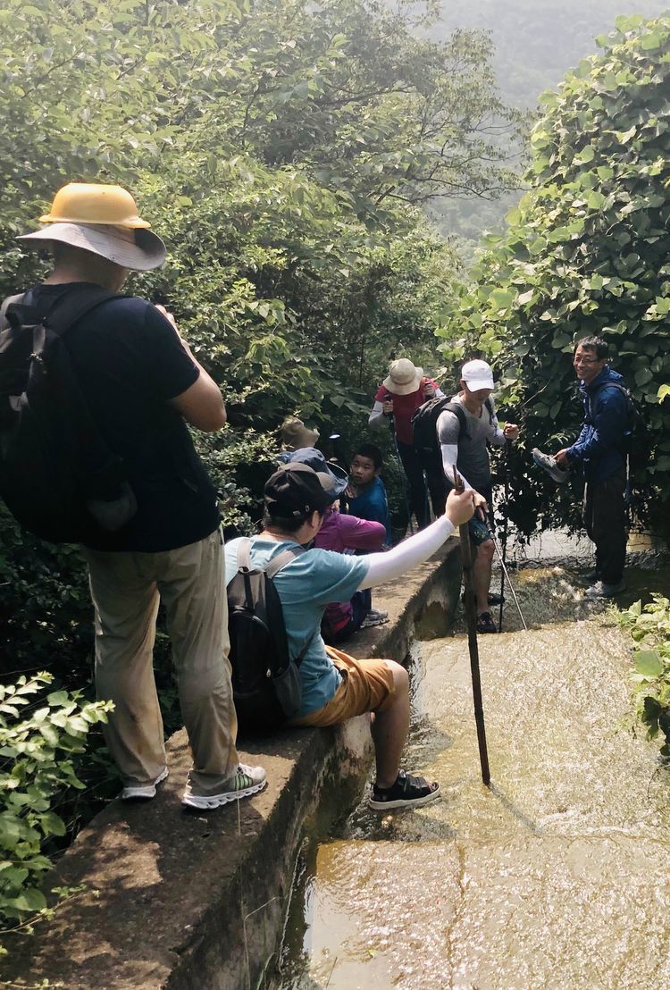向下无路,只有向前,但沟渠泥滑异常,无法行走,渠边沿50公分的沿,在这上有老下有小的队伍,基本排除了行走的可能。好在领队翻下渠沿,硬着头皮,带领大家走上了这段无路可寻的石墙。放下绳索,将队伍拉了上来。