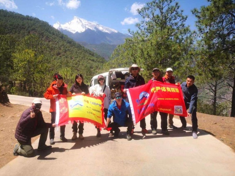 眯了一觉,中途我们车子停下来在哈巴雪山前拍了第一张合照。坛子哥,艾菲,栗子,亮亮,邹兆,老李,蜗牛,骑乐荣荣。哈巴雪山巍峨耸立,心向往之。