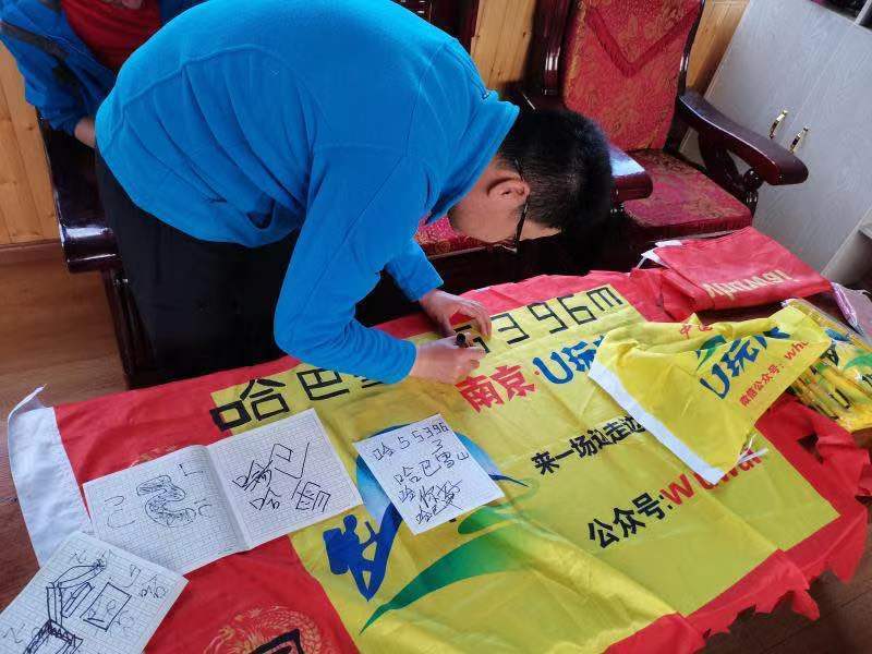 来的路上听说哈巴雪山顶的牌子被风吹走了,心里还是很失落的,毕竟一切的辛苦都为了登顶后的一张帅照。下午我们在我们的旗子上标注了——哈巴雪上5396.并在旗子上签名,登顶就用它合照。