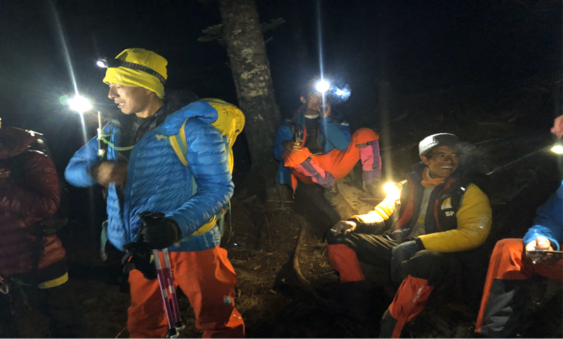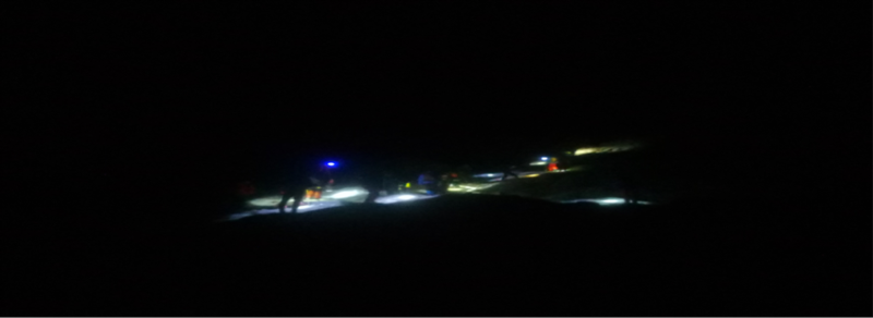 4月6凌晨2:30起床,3点多一点我们就开始登山了。我的领队是一个和我同龄的小伙子,前一天到大本营的路线我走的很快,他听说了我体能很好,所以他一开始就走在队伍的最前面。我本来想和两个朋友一起走的,后来才知道登山是不等队友的。由于我协作的速度很快,我心里是有些慌张的,但男人的尊严致使我始终都没和协作说希望他慢一点。我只能假借着等人,不停的后望,放慢自己的速度。我这个行为被他“骂”了几句,他说:“你到底要等谁?你别以为你自己是最快的,登山比耐力,你到最后不一定能比人家快。”其实呢?我就是心很慌,希望他走慢一些,但我始终没有说出口,咬着牙往上冲。