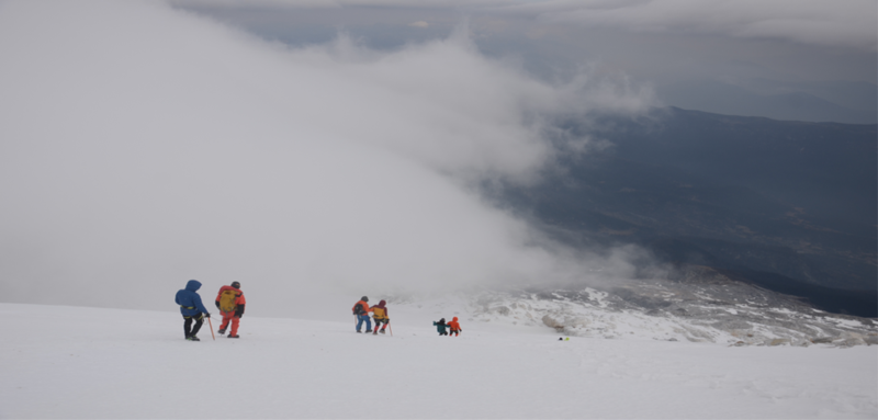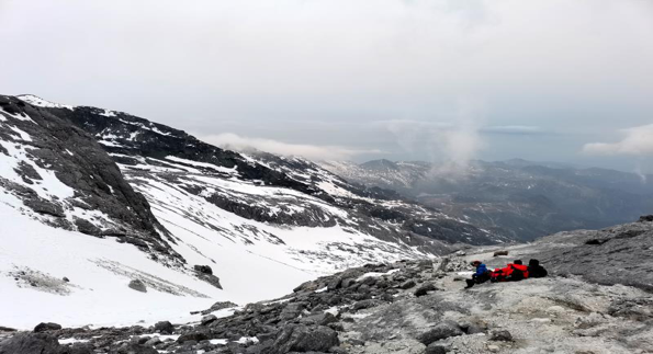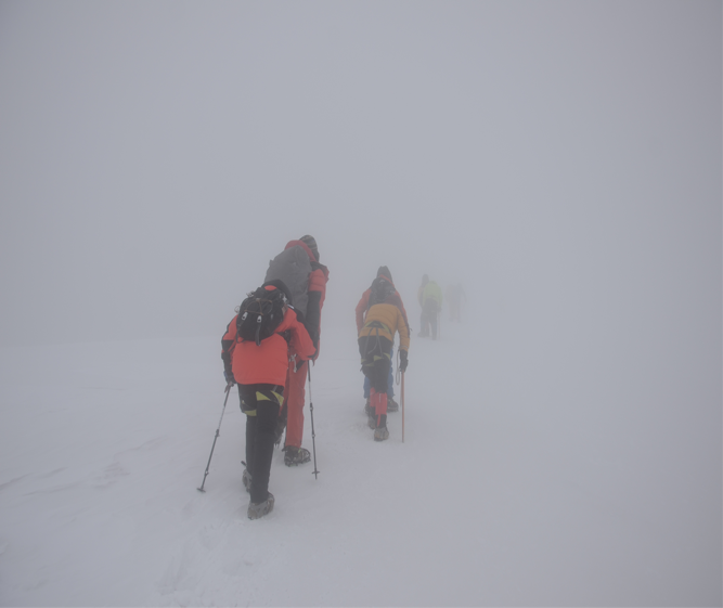 这里给大家一个非常重要的建议,食物,食物,食物。。。一定要准备充足的路餐,最容易下咽的,如:葡萄糖液,能量胶,能量棒。并且将其放在羽绒服内捂着。我早上准备的路餐是面包,到达雪线以上,冻的冰冷,是难以下咽的。热水也不想喝,就这样硬顶着,以至于下撤到一半,体能不支。