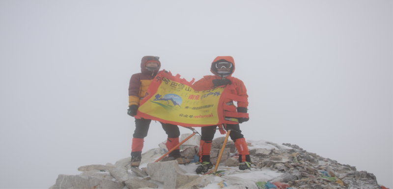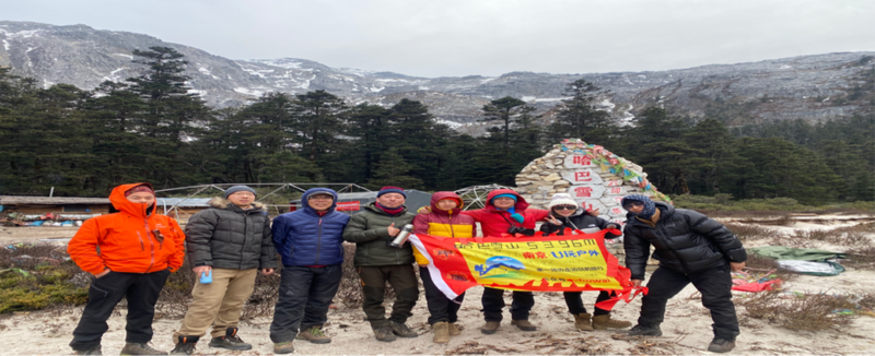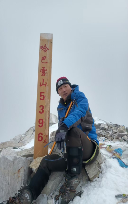 到大本营直接倒下睡着,精疲力竭。吃完午饭我继续休息等亮亮他们,其它人先行下撤回哈巴村。4点的时候,亮亮和蜗牛也下撤到大本营,幸运的他们还发现了一块牌子并拍照。队友登顶照。