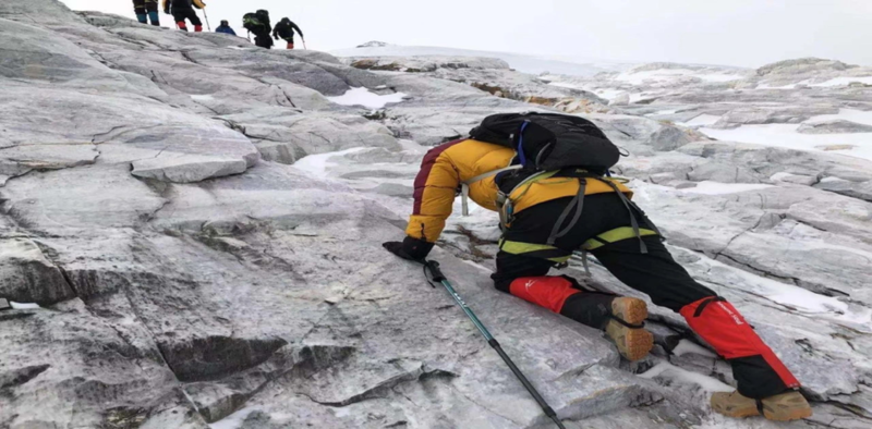 经验总结:再累都要站着,千万不可以坐下。冰爪可以抓雪,如果屁p落地,一旦滑落无法制动,后果不堪设想。