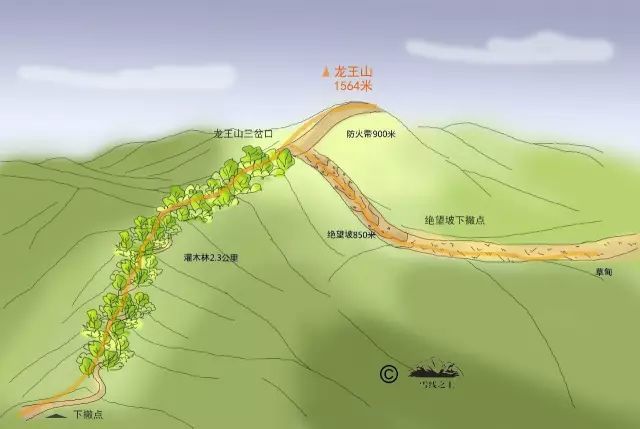 第二尖——到了第二尖龙王山,会遇到一个三岔口。冲顶往返的时间在半小时左右,山友们可以将行李留在龙王山山脊防火带上,轻装冲顶再折返至路口,也可以不冲顶直接继续穿越。