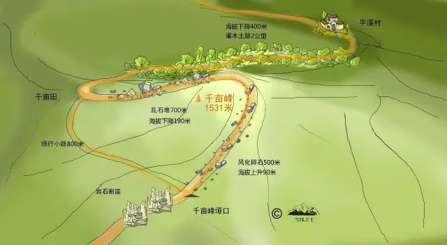 绕过千亩峰去往千亩田的路线约需30分钟。翻越千亩峰,然后从乱石堆下降的路线约需35分钟,乱石堆比较危险
