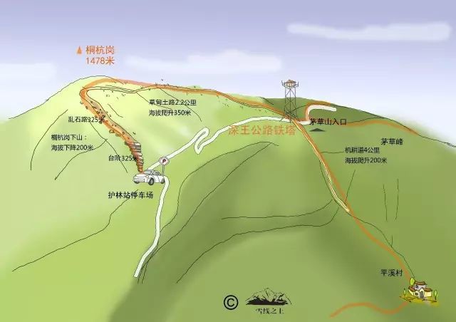 沿平溪村的机耕道走到深王公路铁塔下,大约1小时。