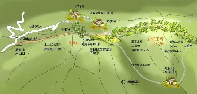 翻越茅草山的路线入口在距执勤点150米远公路旁的一座板房背后,较为隐蔽。机耕路岔口要沿公路再往前走600米。无论是走土路翻越茅草山或者走机耕路绕行,由于在靠近村庄地区,岔路很多,建议跟随GPS轨迹或者熟悉道路者带路。