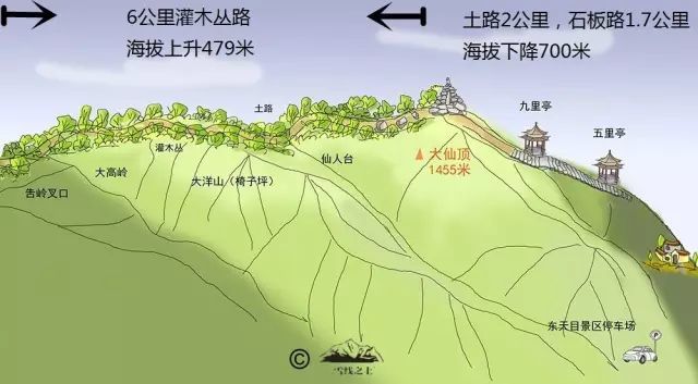 从大仙顶的玛尼堆下山,往上山路线的左侧90度方向才是正确的路线,如果沿上山方向直走会遇到断崖,十分危险。