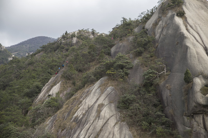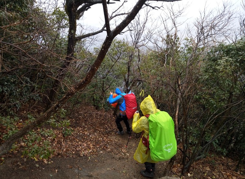 走着走着,地面被雨水浸透了,开始进入溜冰模式,行进速度很慢,大部分人都滑倒过,挂绳子过了好几个险要的地方。