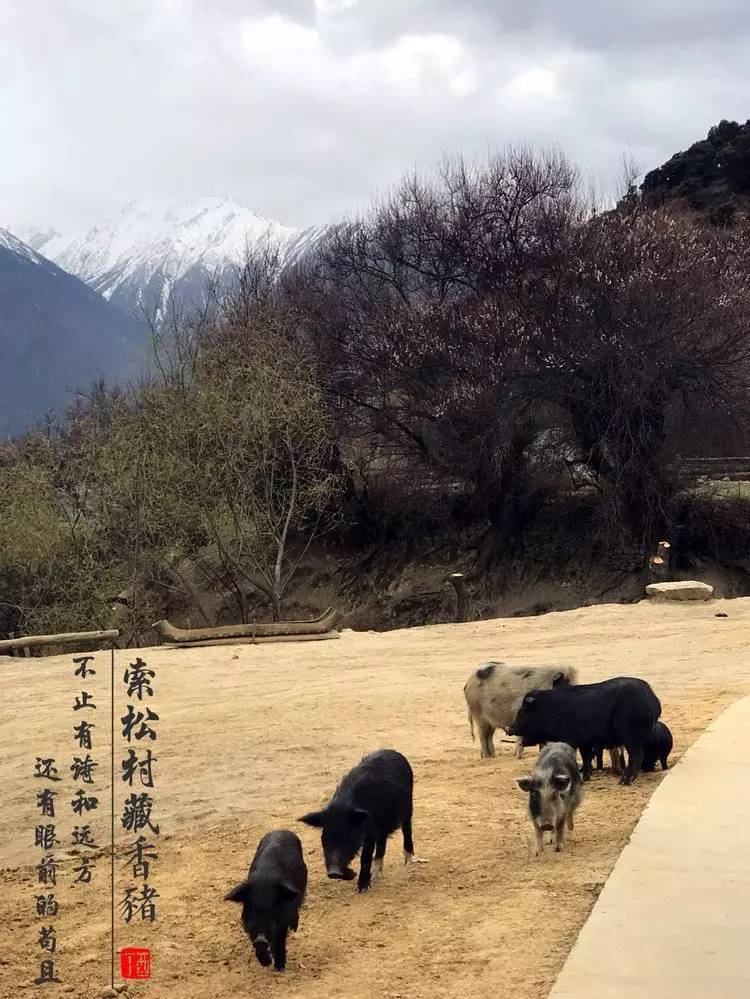 藏民家养猪都是放养,公路边桃树下到处可以看到,三五成群。高原的猪叫藏香猪,大都黑色,个头很小,成猪比我们这的小猪稍大,肉精味美。
