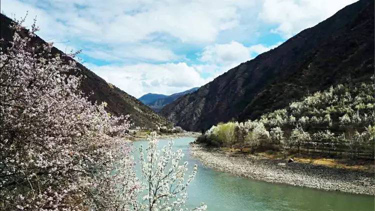 湛蓝的雅鲁藏布江水倒映着皑皑雪峰,一座座山峦连绵成一道起伏的波浪,白云涌动,桃花怒放,几乎要将人世间的钟灵毓秀集于此处。