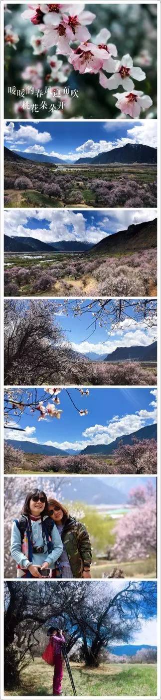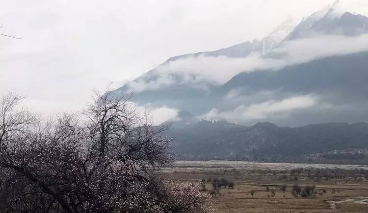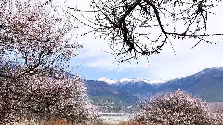 雅鲁藏布江河谷里桃花点点,远处的多雄拉雪山若隐若现,景色壮观!