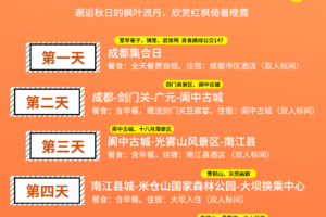 (1)集合日为自由活动,不是正式的行程,请在自由活动时注意人身财产安全,集合日不含保险。到集合酒店报“行摄光雾山+姓名”拿房,房费已付,押金自付,活动报名截止后,我们才开始预定房间。一般在出发前3天,我们会将酒店信息发送到您的手机。