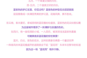 今早,大家可以换上浅色亮丽的衣服。我们将会带大家打卡昆明蓝花楹最集中的2处:盘龙江整个江岸一片紫蓝,低眉的蓝花楹是江水的霓裳衣,也是天空的调和色。天空、花瓣、江水融为一体,蔚为壮观,只叹“此中有真意,欲辩已忘言”。