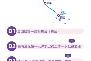 各地队员全天昆明酒店报道,(集合指定地点提前两三天通知)。如果抵达时间早的,可以自行到海埂大坝附近逛逛,那边有云南民族村景区和西山国家风景区,从民族村可以坐索道上去到西山风景区,到风景区龙门可以远眺整个滇池和大片昆明市区,风光很美。还可到翠湖公园附件逛逛陆军讲武堂,翠湖南门也有一些蓝花楹可以欣赏;去南屏步行街品尝当地最特色的汽锅鸡或过桥米线,也可品尝关上野生菌火锅等特色美食;也可以先去昆明市:云南财经大学、翠湖、北京路片区、红锦路、前卫西路、环湖路和宝海公园等其它昆明10余处,也满是“蓝紫色”的身影,处处是它尽显绰约风姿的舞台。回酒店前记得顺便在超市采购巧克力,牛肉干,酸奶等路上的零食。酒店可全天办理入住手续。