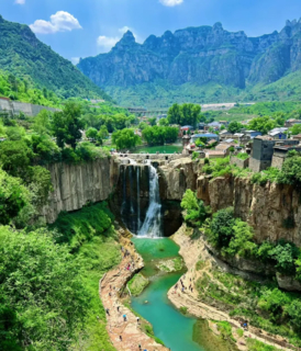 午餐后驱车开往【虹梯关虹霓村国家4AAAA 风景区】打卡新晋网红地-虹霓村:在山西省平顺县的太行山深处,散落着不少建在半山腰悬崖绝壁上的村落。村里的房屋错落有致,户户相连,背靠大山,面临悬崖,远远望去像挂在山崖上的楼阁。虹霓峡谷西高东低,地处于太行山东南边缘地带。虹霓村就是在虹霓河山边的崖畔之上,背山面水。崖高谷深的虹霓河水流,经这里高约百米的悬崖,形成100多米高的虹霓大瀑布,从上游峡谷流下,又倾溅到另一个峡谷,极其壮观。