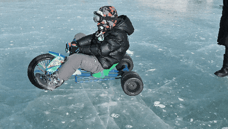 冰上自行车:三轮的构造让自行车不会倾倒,就算不会骑自行车,也可以在冰上享受骑行乐趣。但看似简单却隐藏着骑行小技巧,看你能不能拿捏它?