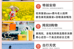 温馨提示:春天的罗平满眼都是金灿灿的黄,几十万亩油菜花满山偏野地开放,非常充裕的时间留给您尽情拍照,还为您准备了特色民族服装让您尽情地放飞自我,凹造型!晚上弥勒的美食您也不能错过哟。