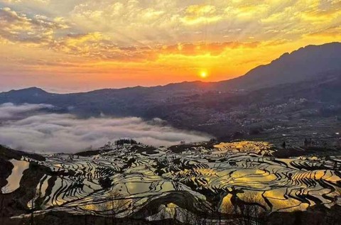 晚点前往【坝达梯田】拍摄日落。坝达景点是申报世界文化遗产核心保护之一、坝达梯田气势磅礴、面积广阔、立体感强、从海拔800米的麻栗村河起、依山而上、3700多级梯田棉不断、廷伸至海拔2000多米的高山。晚上入住元阳景区酒店。