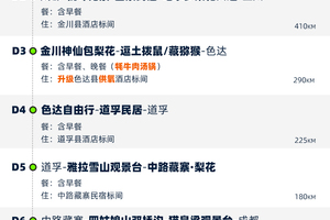 4、门票:四姑娘山双桥沟观光车70元/人(必须),色达预约48-168元/人,报名后请根据自己的游玩日期自行预约;