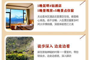 2、7晚优选酒店标间住宿:1晚四钻酒店+1晚景观房(梅里雪山)+5晚景点住宿 :昆明市四钻酒店一晚,老姆登民宿客栈一晚,独龙江酒店一晚,丙中洛酒店一晚,飞来寺酒店一晚(景观房),白水台景区酒店一晚,老君山景区酒店或客栈一晚;