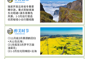 1.【市面独家】独家开发云南省冬春景精华游,重点赏秘境滇东北昭通+滇东南春色风景。1-3月出行首选优质秘境小众行摄线路。