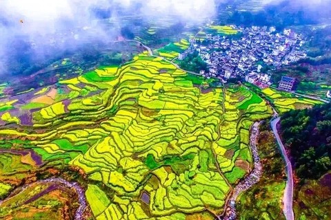 三四月安徽家朋梯田菜花,隐秘开放。在古村落和群峰环峙之下,构成了一座“藏起来的花海梯田”,极为壮观。这壮观的油菜花田夹杂小麦梯田,一层黄一层青,“双色花海”错落有致,在此疯狂拍照留影吧!