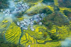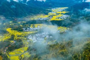 江岭或许是婺源最值得去的地方,因为那里漫山遍野的油菜花是呈梯田状,从山顶铺散到山谷下。站在山顶望去,脚下大片的山谷内,油菜花层层叠叠,一望无际,中间围拢着几个小小的村落,黑瓦白墙的徽派民居夹杂在一片金黄之间,唯美意境。尤其是早上晨雾弥漫之时,非常壮观。