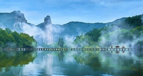 【仙都-朱潭山】长长的石桥横跨在清澈的溪水之上,老农牵着牛缓缓而归,远处的山峰和田园构成了一幅动态的水墨画。让仙都名扬四海的照片就是取景于此。