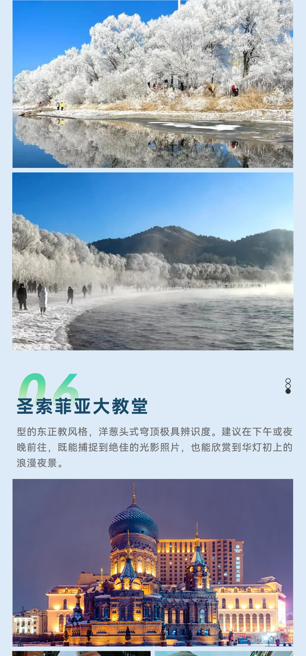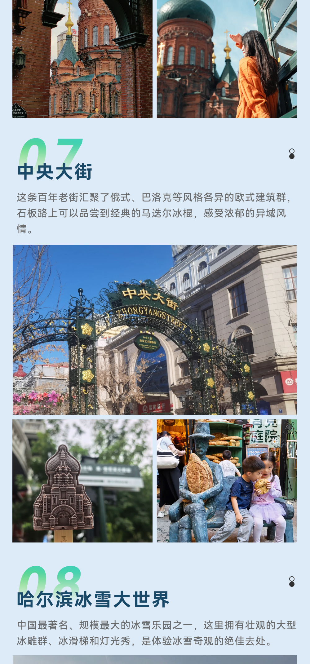 百年老街中央大街、索菲亚教堂、斯大林公园、防洪纪念塔、著名的太阳的公园、松花江,到了12月份开始还有冰雪大世界(自费前往)