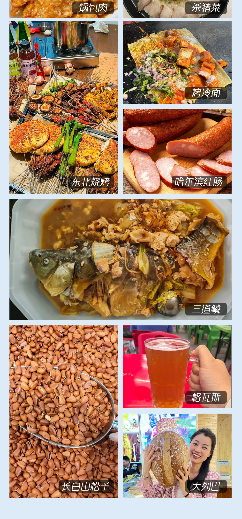 马迭尔冰棍、秋林红肠、昆仑小菜馆、烧烤、铁锅炖、锅包肉、地三鲜、杀猪菜