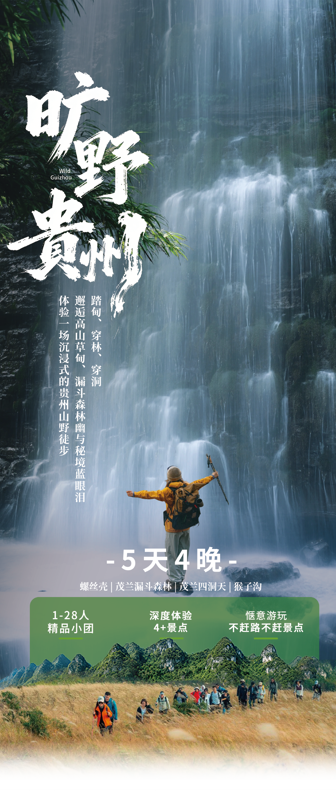 早餐后乘车出发旅程的首个秘境——螺丝壳高山草甸,打卡《陈情令》拍摄地;热身后徒步下至一个不知名却十分壮观的瀑布,随后穿越高山草甸至鹰嘴岩,这里的视野十分开阔,也特别适合出片,随后环线徒步回到起点乘车前往都匀市入住酒店。晚上自由打卡西山大桥、石板街、品尝当地特色美食等。