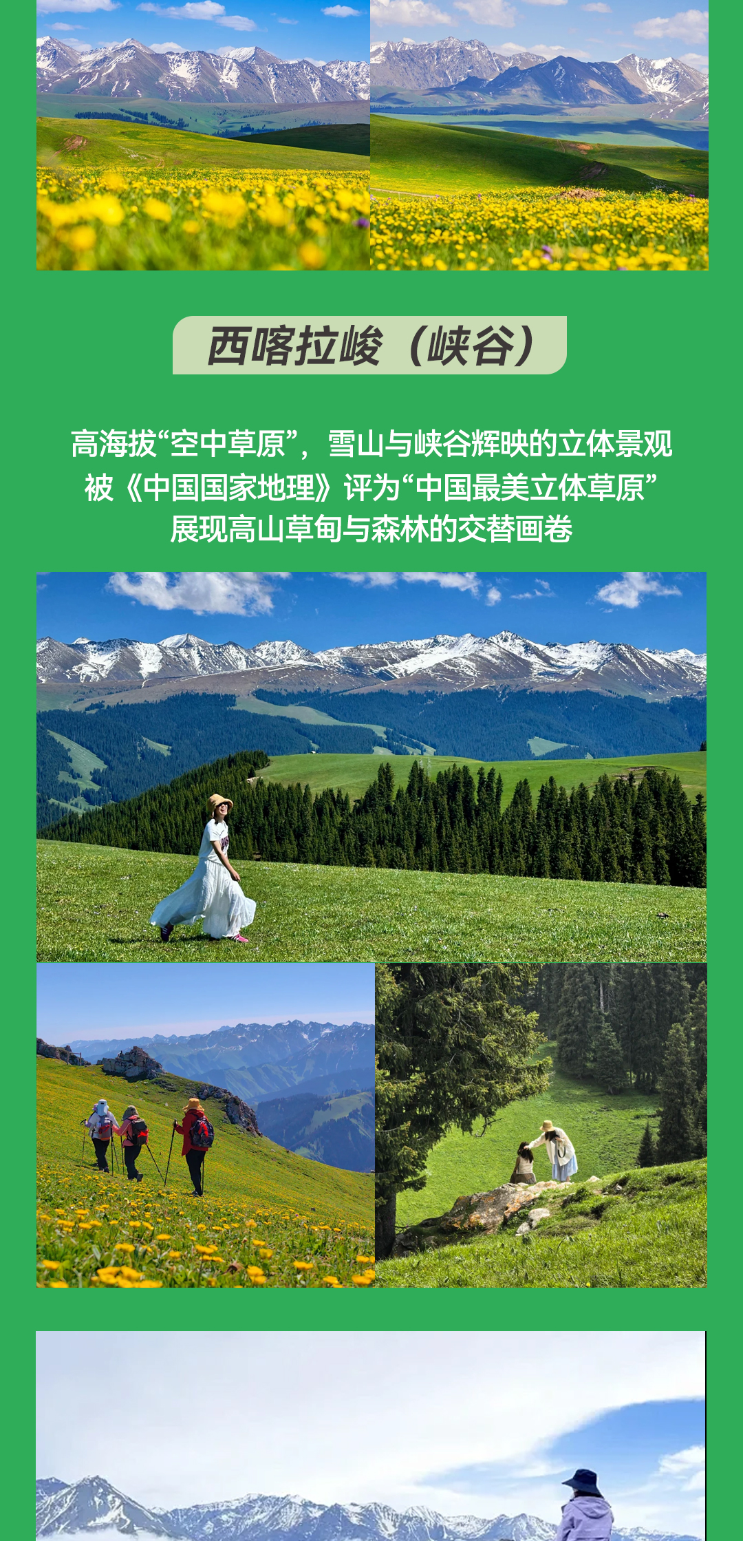 早晨9点,从琼库什台村出发,翻越村前达坂,到达山顶俯瞰全村全景:村庄、草原、树林、河流与雪山完美融合,如梦如幻。随后下行至库尔代河,在河边树荫下享用午餐,感受自然的宁静。午后挑战全程最大的上坡,爬升600多米,抵达西喀拉峻核心区域——加撒干,这里风景壮丽,是电影《鲜花》的取景地,充满故事与魅力。到达营地后搭建帐篷,领队将带领大家拍摄风光大片,傍晚还能欣赏中天山落日金山的壮丽景象。