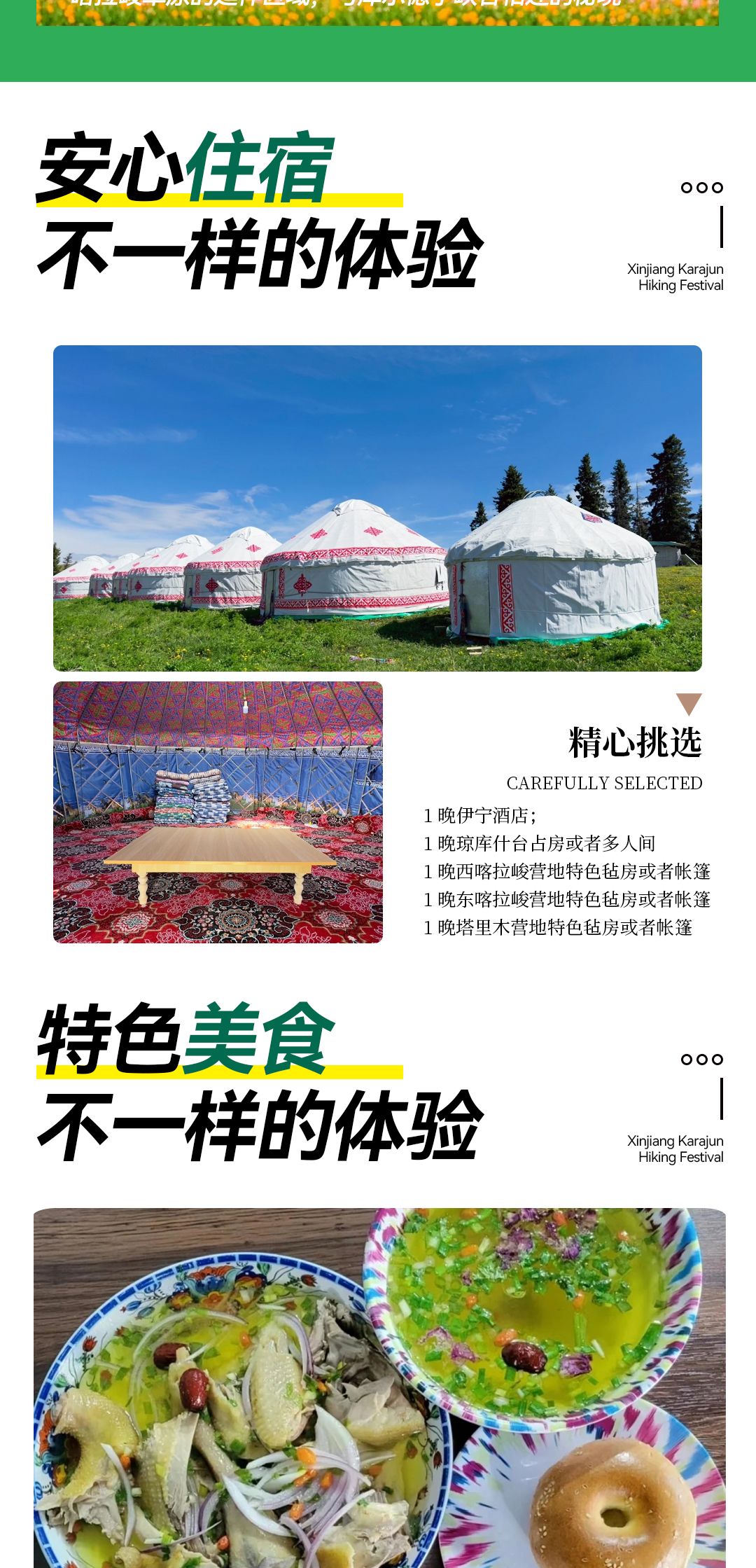 2.住宿:按行程所列标准入住 (1晚伊宁酒店;1晚琼库什台占房或者3-4多人间,1晚西喀拉峻营地特色毡房或者帐篷、1晚东喀拉峻营地特色毡房或者帐篷、1晚塔里木营地特色毡房或者帐篷;毡房一般睡4人)