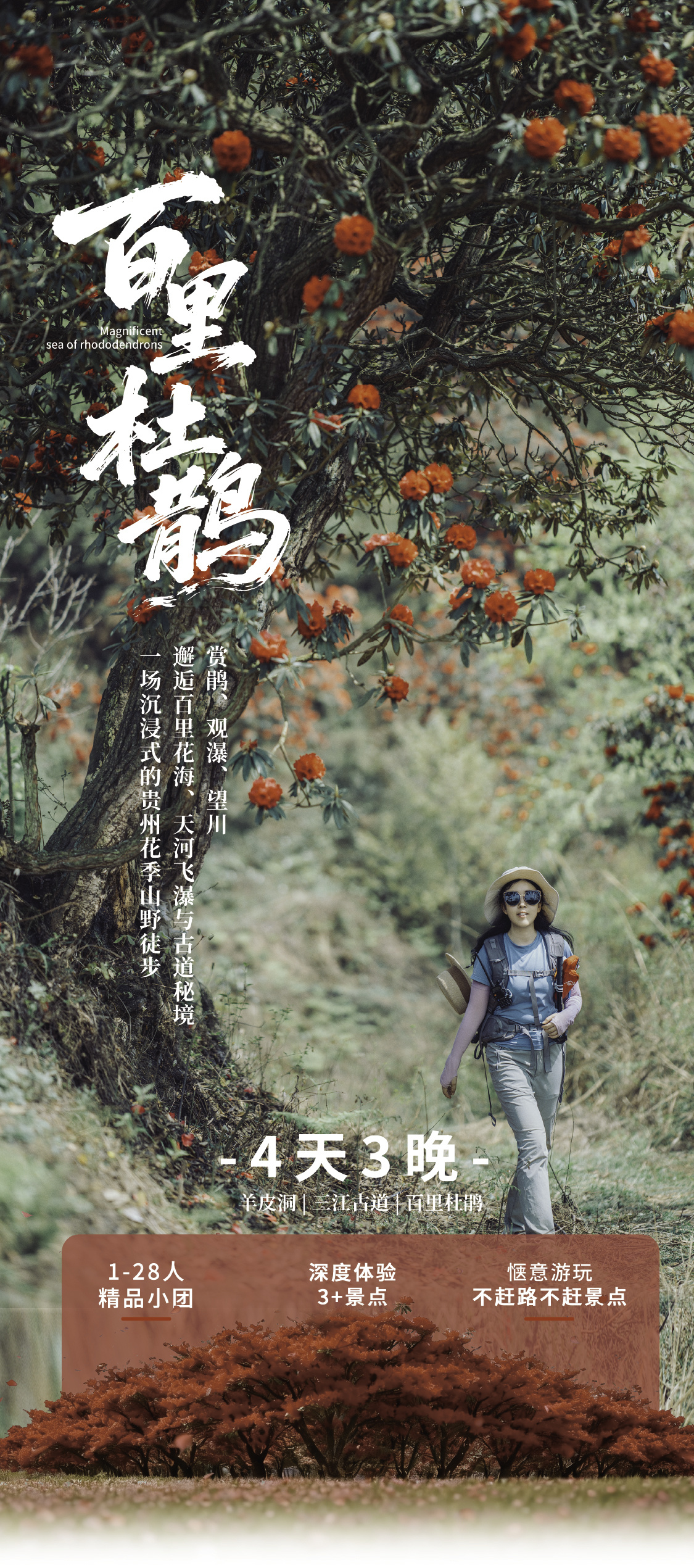 早餐后,乘车出发——百里杜鹃。抵达徒步起点,热身后开始徒步,沿途游览茶海花地,杜鹃花海;(我们徒步路线避开了百里杜鹃景区的人山人海,路线游人稀少,不用排队人挤人,独享一片壮美的花海)。