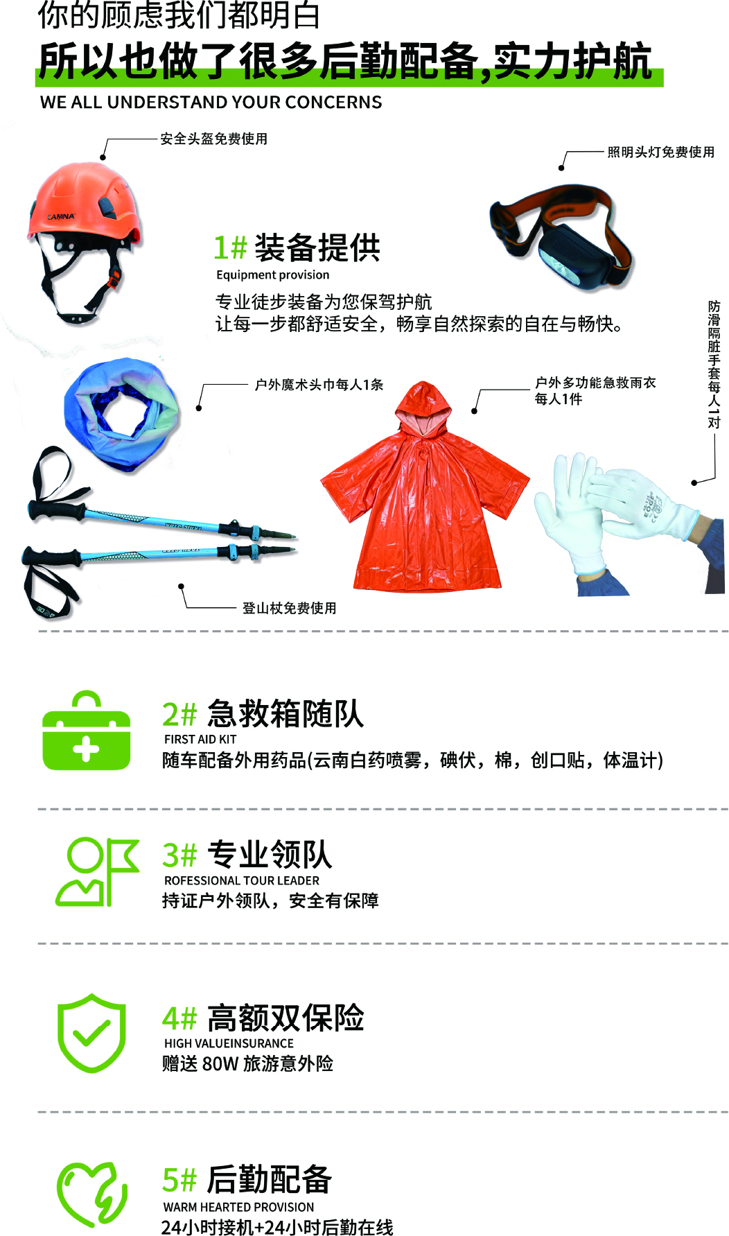 3.活动提供装备中说明的:头盔/头灯/登山杖/免费租借(用后回收),赠送头巾/手套(不回收)