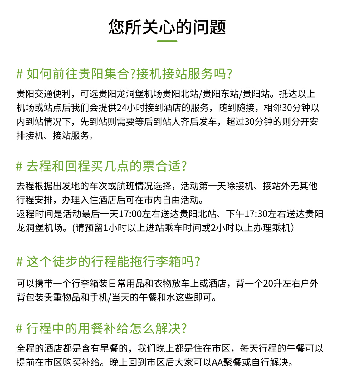 ② 酒店一般在14:00后方可办理入住,早到的小伙伴如未到酒店入住时间,可在酒店寄存行李自行游玩贵阳。领队会在集合当天下午在活动群内发布第二天行程需要准备的物品和注意事项及告知次日行程安排