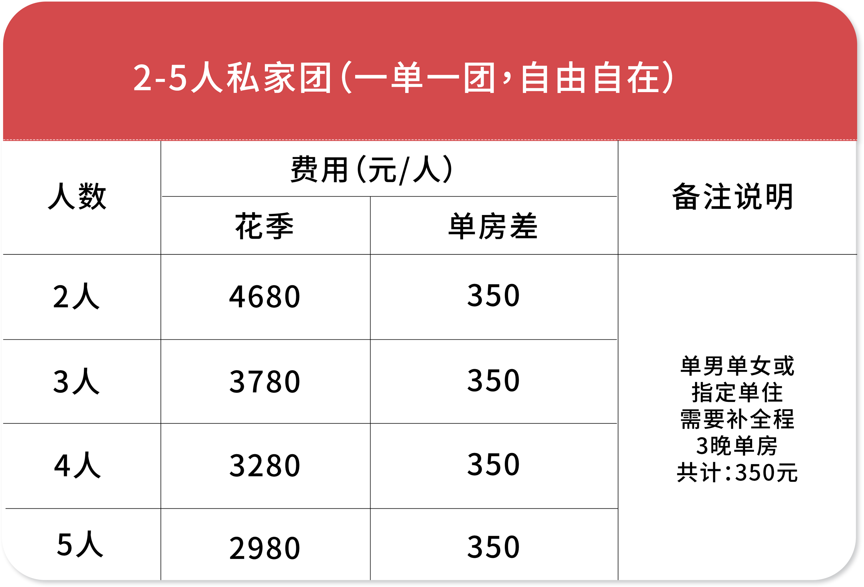➂ 单房差:单人报名默认同性拼房(拼房不成功无需另付单房差);指定单住或不愿意拼房(需补全程3晚单房差价共计:350元)、1成人带1儿童时(儿童必须得占床位),2人一起报名默认住1间房(如需分开住请主动说明)