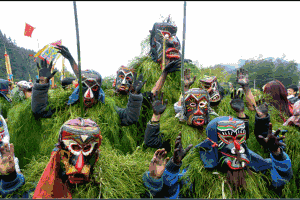 芒篙的面具形象均龇牙咧嘴、表情怪诞。芒篙手中的竹棍是神力的象征,他们不断挥舞竹棍,借助竹棍向前撑空翻,向后抵以仰天,蹲、跳、翻、躺,演示功力以此驱魔压邪、禳灾去祸,保护村寨平安。