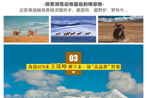 今天,我们将换乘城市SUV前往可可西里自然保护区,感受这里的苍茫之美和生命之贵。早餐后,乘车翻越昆仑山口(4776M),前往【索南达杰自然保护站】,沿着青藏线前行,途经游览(昆仑神泉、不冻泉保护站、西大滩观景平台、无极龙凤宫),在西大滩能直面拍摄玉珠峰(6178M)。沿途可以看到各种野生动物,藏原羊、藏野驴、狐狸,幸运的话也可以遇到极少见到的藏羚羊!在昆仑山口,我们可以看到可可西里藏羚羊雕塑,还可以凭吊索南达杰纪念碑,美丽而荒凉的藏青色高原,绵延起伏的山岭,成群的藏羚羊和野驴,还有途中那些沿着天路磕长头的信徒,都能让你身心浸没在藏地风情中。