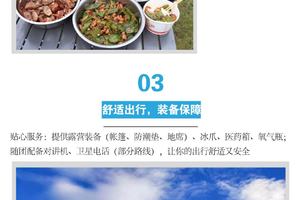 3、餐饮:全程所有餐费共计11正9早,如行程中所列,营地晚餐为两荤一素一汤,提供热水.营地早餐为粥、榨菜等。