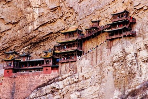 悬空寺位于山西省大同市浑源县恒山金龙峡西侧翠屏峰峭壁间,原叫“玄空阁”,“玄”取自于中国道教教理,“空”则来源于佛教的教理,后改名为“悬空寺”,是因为整座寺院就像悬挂在悬崖上,在汉语中,“悬”与“玄”同音,因此得名。建成于公元491年,是佛、道、儒三教合一的独特寺庙。“悬空寺”建筑极具特色,以如临深渊的险峻而著称,素有“悬空寺,半天高,三根马尾空中吊”的俚语,以如临深渊的险峻而著称。