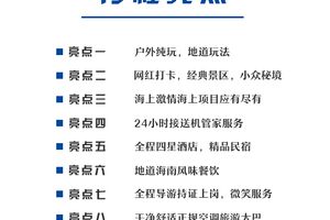 我们深度挖掘了海南特色 浮潜,深潜,冲浪,帆船,赶海 采摘椰子,渔家乐等当地元素 海口集合,三亚结束,不走回头路 让你体验一个不一样的海南岛